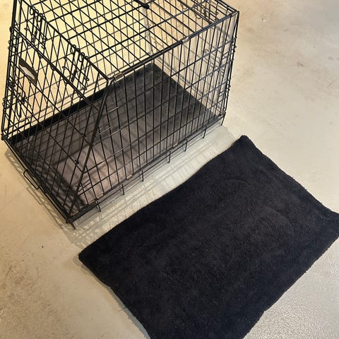 Passer til Ford fiesta. Se målinger på billedet. Medium hunde fra cocker til terrier 10-15 kg. Buret har en solid konstruktion med gitterelementer og en låge med låsemekanisme. Det er designet til sikker opbevaring og transport af hunde. Har brugt den på tur i Sverige og Tyskland.