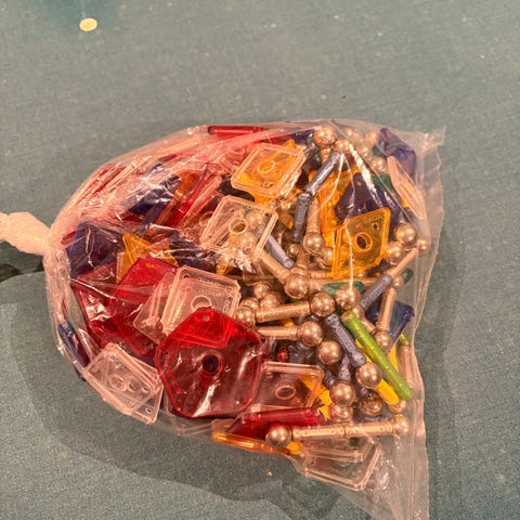 Geomag magnetisk byggesæt til børn med forskellige farvede magnetiske stykker i forskellige geometriske former. Sættet indeholder firkanter, trekanter og andre former, der kan samles til forskellige konstruktioner. Materialet er plast og metal med magnetisk funktion, designet til kreativ leg og læring.