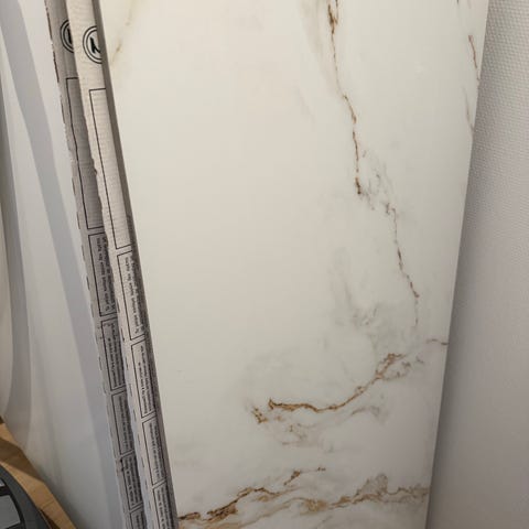Fliser i størrelsen 32,7x32,7 cm med hvid farve og marmormønster. Tykkelse 7 mm.