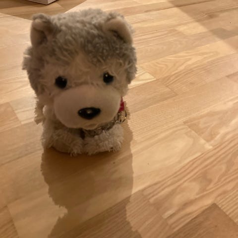 To små hunde med lyd og bevægelse. Bruger batteri. Den ene kan gå og sige lyde den anden har fjernbetjening g med forskellige gø lyde ( denne er noget slidt)