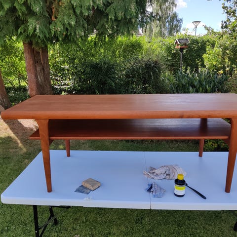 Flot teak sofabord fra 60erne. Ny olieret. Står rigtig flot. Med spor af brug.
