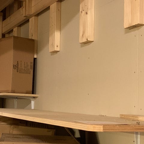 Hylder til skur eller garage, kraftige plader. Vi har 3 x 4,05 mere plus 1 x 2,5 cm lang. Længden kan naturligvis deles. Stykpris 120,- samlede pris