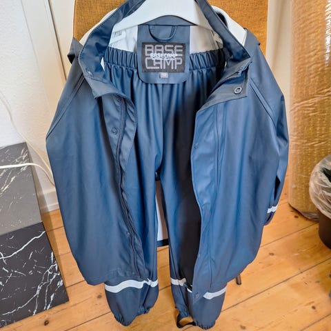 Regnsæt bestående af en jakke med hætte og et par overalls. Jakken har elastik ved ærmerne og en refleksstribe. Overallsene har justerbare seler og elastik ved anklerne samt refleksstribe.