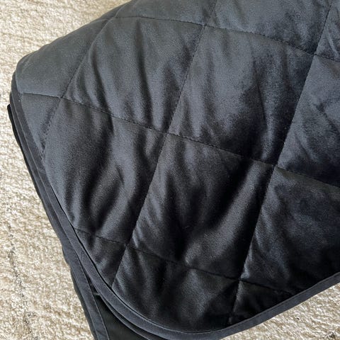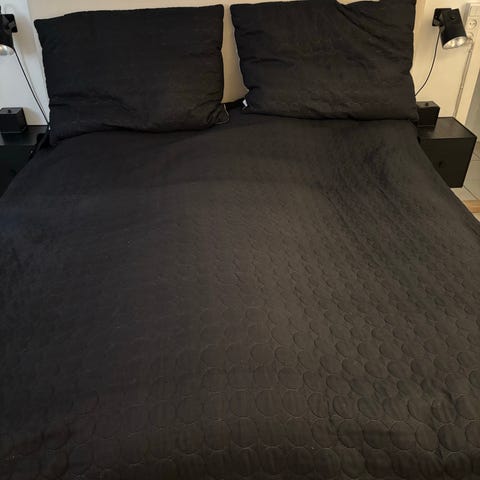IKEA tæppe og pude sæt i brun og beige. Sættet består af et quiltet tæppe og en matchende pude med lodrette syninger. Materialet er blødt og har en kombination af brun og beige farve. Tæppet har afrundede hjørner og syning langs kanten.