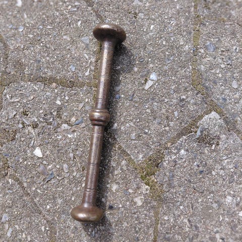 Tung messingmorter med støder 13 cm i diameter, 13 cm høj, støderlængde 26 cm, samlet vægt +/- 4,8 kilo med støder