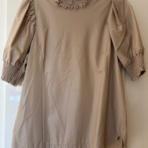Blusen er lavet i en let og transparent kvalitet med rund hals, lange ærmer og en fin brystlomme med klap.