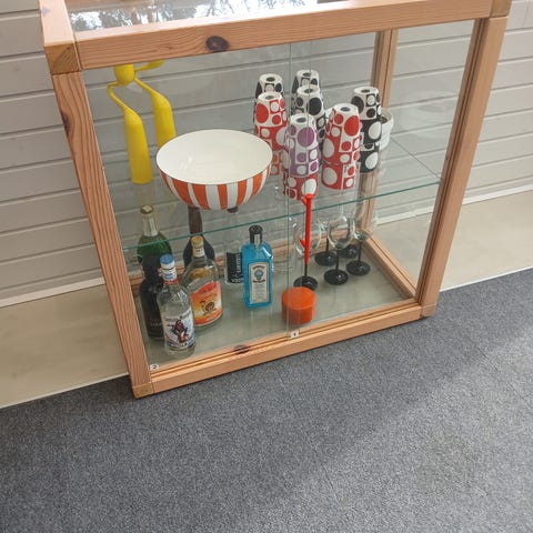 Vitrineskab i træ og glas fra samarbejdet mellem IKEA og Off-White, designet af Virgil Abloh (Louis Vuitton).