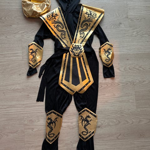 Kai Ninja kostume til slag i str. 104-116 4-6 År. Der medfølger et Ninjago svær som er købt i Legoland.