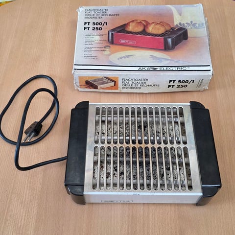 Brødrister med en del brugsspor, derfor prisen. Fungerer og er klar til brug.