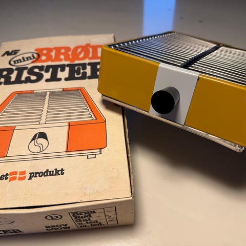 Vintage / retro brødrister. Model: Mini. Dansk design. Bordmodel. 220 volt, 500 watt. Måler: 22,5 x 18 cm højde: 6,5 cm.