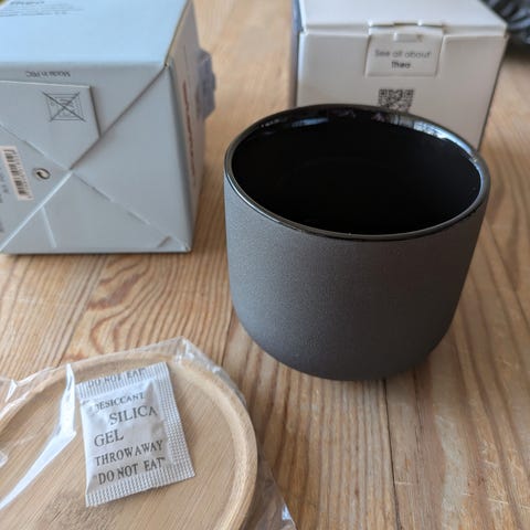 2 Stelton Theo kopper i beige med låg i træ. Sættet indeholder to krukker i keramisk materiale, også velegnet til opbevaring af småting i køkkenet eller andre rum.