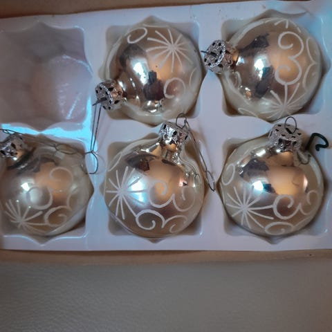 ældre julekugler i æske