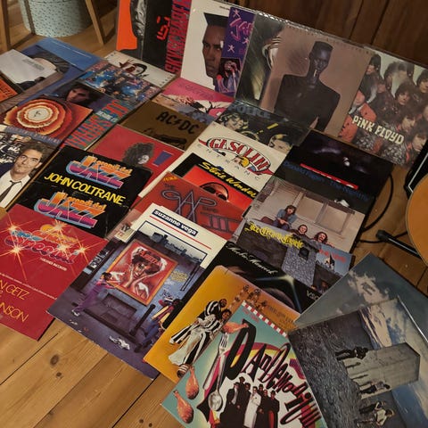 Samling af diverse vinylplader med musik fra forskellige kunstnere og genrer.