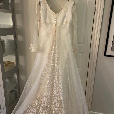 Lyserød kjole til kvinder fra Karim Designs i størrelse 42. Kjolen har en lang, flydende skørt og en overdel med V-udskæring. Materialet fremstår let og egnet til formelle lejligheder. Nypris 17.700 https://karimdesign.dk/collections/brudekjoler/products/gabriella