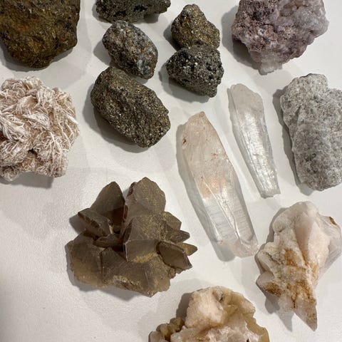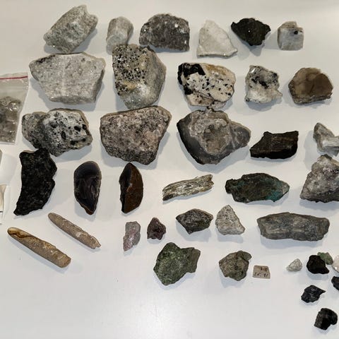 Geologisk prøvesæt indeholdende forskellige vulkanske og mineralprøver som pomice, covellina, gletche af carbonat, lava rosa, soca nera, zolfo, minetite og olivina.