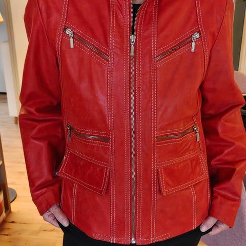 Jakken har quiltet mønster på skuldrene og flere lynlåslommer foran. Jakken er fremstillet i 100% læder.