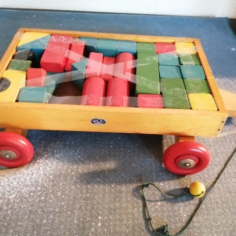 To fine vogne i malet træ fra Jukka Finland. Flot retro lejetøj i fin stand. Vognene kører super fint og delene skal tages af og sammensættes på forskellige måder til mange timers leg.