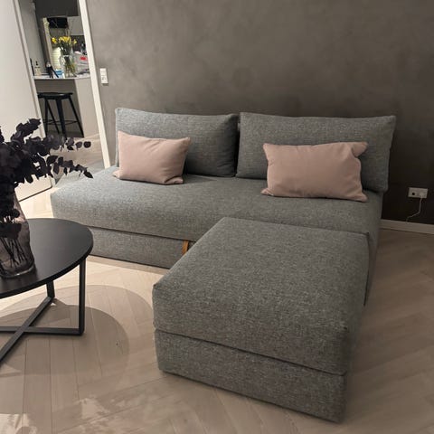 Elegant sovesofa med armlæn i eg og loungstol/puf fra Innovation Living, designet af Studio WeissKrogh og Per Weiss. Splitback sofaens ryglæn er delt op i to, hvoraf hvert ryglæn er udstyret med 3-trins elevation.