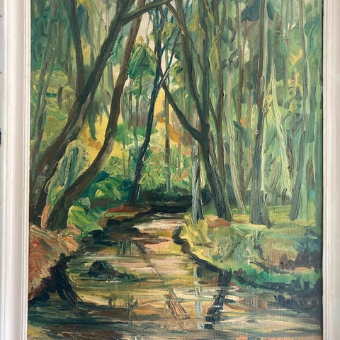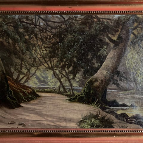 Fint grønt og lille maleri, der giver lidt farve til rummet.