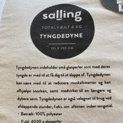 Tyngdedyne fra Scandinavia rest. Udgået model i 220x200 og 11 kg. Sælges da jeg fik en mindre, der passede bedre og aldrig fik brugt denne. Er derfor helt ny. Nypris var 2000
