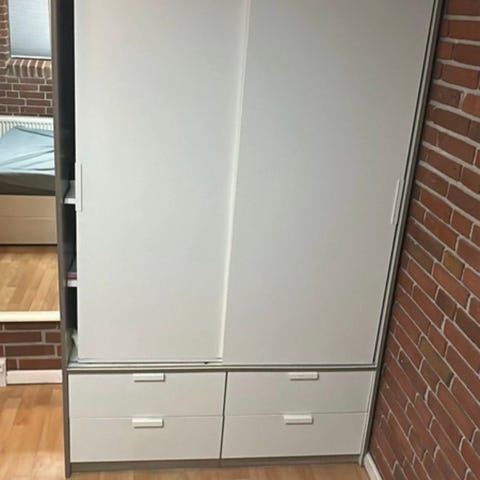 IKEA skab i hvid med flere hylder og skuffer. Skabet har en enkel og funktionel opbygning med justerbare hylder og skuffer til opbevaring. Velegnet til opbevaring af forskellige genstande i hjemmet eller kontoret. Har været brugt som ekstra skab i køkkenet