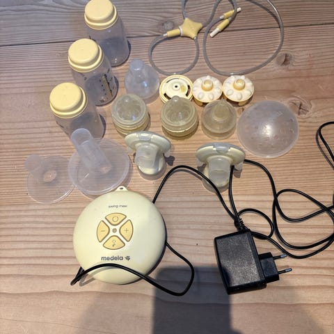 Helt ny medela swing maxi brystpumpe, kun vasket. Derudover er der to ekstra flasker og to tragte i str. 27 med også. Ny pris er 2000kr. Byd gerne.