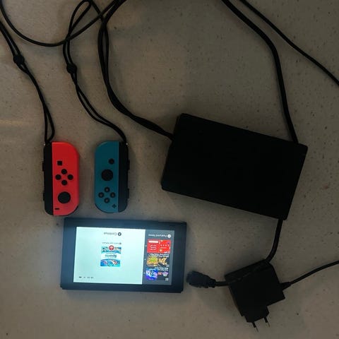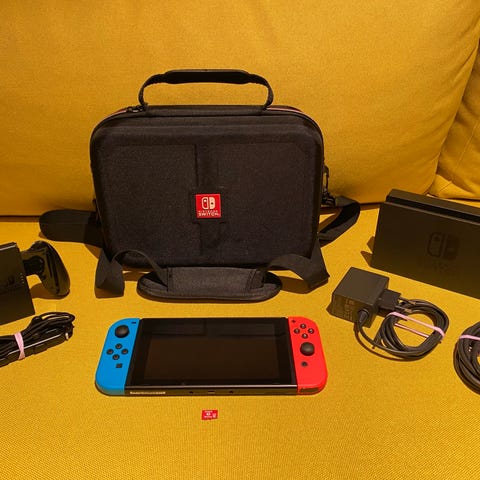 Nintendo Switch spillekonsol med neonrøde og neonblå Joy-Con-kontroller. Konsollen har en skærm til håndholdt spil og kan også tilsluttes TV via docken. Inkluderer et beskyttende etui og dock til tilslutning til TV. Mangler original lader. Har brugsridser men ikke noget man mærker under spil