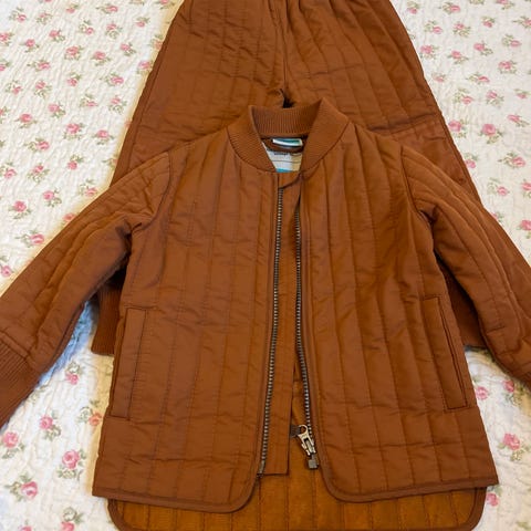 Sættet består af en quiltet jakke med flæser og sølvfarvede prikker og en matchende quiltet buks. Jakken har en høj hals og lukkes med lynlås. Bukserne har elastik i taljen og ved anklerne. Sættet fremstår i god stand. Dog er prikkerne lidt slidt af ved knæene.