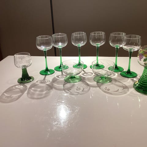 Mindre glas med karakteristisk slebet stamme og sort fod. Typisk mellemkrigstidens serviceglas.