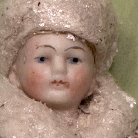 Søg ældre vatfigur lavet i vat med sødt antik oblat af drengeansigt. Han har en muffe i hænderne med skøjte. Han måler ca. 14,5 cm