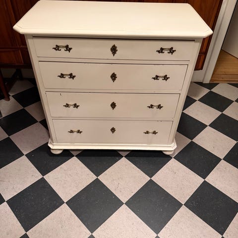 Den blev i den forbindelse renset, slebet ned, huller mm blev fyldt, skufferne fik folie og lister og den blev malet med lys turkis astma & allergi certificeret maling, og fik samtidig nye håndtag på de 4 store skuffer. Dertil ny bagbeklædning, da den gamle var blevet ødelagt.