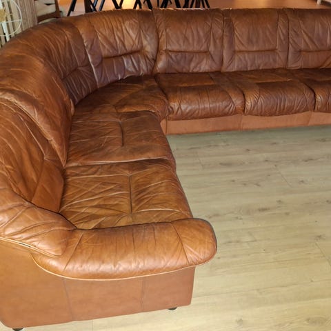 Mørkebrun lædersofa , sælges meget billigt . Ok stand meget blød og god kvalitet.