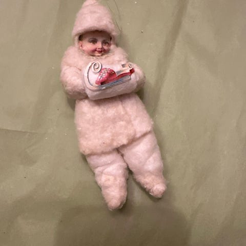 Sød antik julepynt i vat, det forestiller baby i svøb med antik oblat og fin sutteflaske i vat. Figuren er lavet af vat med lyseblå stof og dresdnerstjerner og baby oblat.