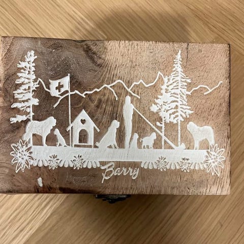 Bakke i træ med Sankt Bernhard hund