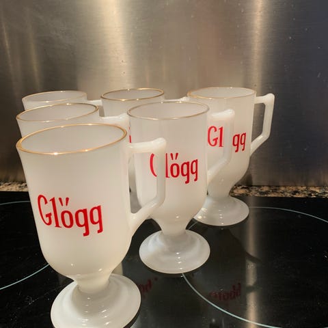 Punch/Gløgg skål i klart glas med tilhørende 6 små glas og en ske. Skålen er rund og rummelig, velegnet til servering af punch, gløgg eller lignende drikkevarer. ved sociale sammenkomster. Kopperne har hank og er designet i samme klare glas som skålen. Skeen er af plastic.