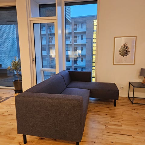Fin 3-personers sofa med chaiselong mod høre. Den er cirka 230 x 145 cm (målt med chaiselong).