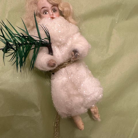 Sød lille antik pige på gynge. Pigen er lavet i vat med oblat, crepe skørt og pynt ved kyse. Blusen er pyntet med dresdner stjerne. Den måler ca 13 cm.