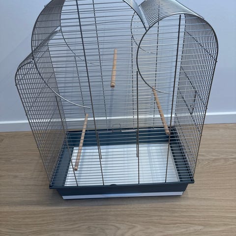Hvidt fuglebur med stativ, inkluderer flere siddepinde, en hængekøje, foder- og vandbeholdere samt en redekasse. Buret har flere niveauer og er designet til små fugle. Stativet har hylde til opbevaring af fuglefoder og tilbehør. Der medfølger en enkelt undulat, som er ideel som starterfugl.