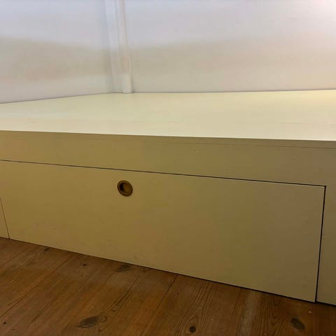 Sengen har fire skuffer til opmagasinering af alt fra sengelinned til håndklæder og alle de ting man ellers ikke kan finde plads til. Skufferne er forsynet med hjul, så de let kan trækkes ud og atter skubbes på plads igen.