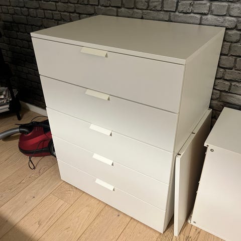 IKEA garderobeskab med tilhørende kommode. Skabet er i en hvid farve og har forskellige rum til opbevaring, herunder skuffer med udskæringer som håndtag og et skab med hylde og tøjstang. Skabet er velegnet til opbevaring af tøj og andre genstande. Den tilhørende kommode er samme farve og måler 65x60x60 cm.