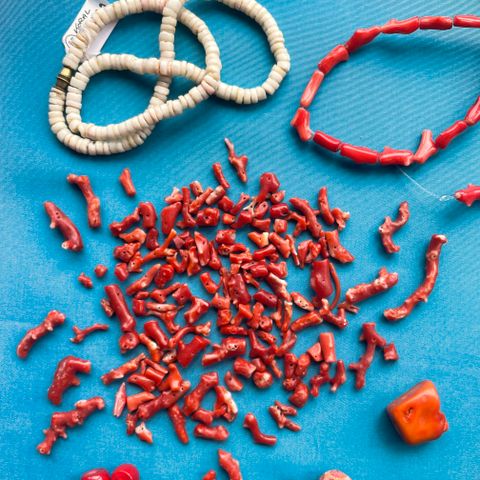 Indisk inspirerede hippieperler, fra ca. 80’erne. Kan ikke huske om de røde er i træ eller glas.