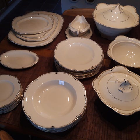 5 rigtig fine engelske tallerkner, dia 22,5 cm i flot stand. Pris pr stk 20 kr. samt to tilhørende fad, 24 cm lang og en lille rund skål, 20 cm i dia.