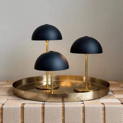 Minibordlamperne, ALONG, med indbygget LED og touch-teknologi har et harmonisk og tidløst design. De ledningsfrie lamper er fremstillet i messing med lampeskærme i farvet metal. Lampens 3 lysstyrker er behagelige og blændfri.