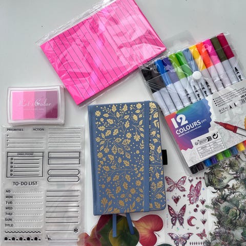 Sæt bestående af tre notesbøger i forskellige farver (sort, lyserød, pink). Hver notesbog har størrelse A5 og indeholder linjeret papir. Notesbøgerne har farvet kant på siderne og et bogmærkebånd til markering af sider.