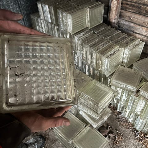 Sæt af glassten i flere farver såsom gul, grøn, rød og blå. Glasstenene har forskellige størrelser og kan anvendes til dekorative formål eller som byggemateriale til lysindfald.