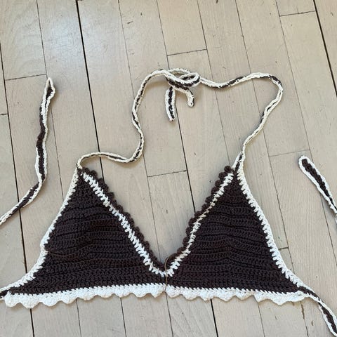 Virkelig flot rød hæklet top/bralette med perledetaljer og lange frynser, som giver den helt rigtige boho/festival-vibe. Den er super fed over en top, bikini, til højtaljede bukser eller nederdel – og den ser sindssygt godt ud i solen 🌞