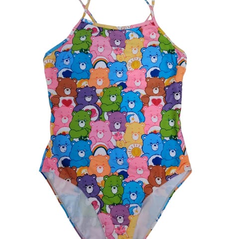 multifarvet badedragt til kvinder i størrelse XXL, fremstillet i polyester. Badedragten har et farverigt mønster med forskellige nuancer og er designet til svømning og strandbrug.