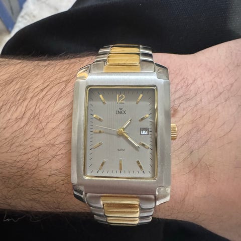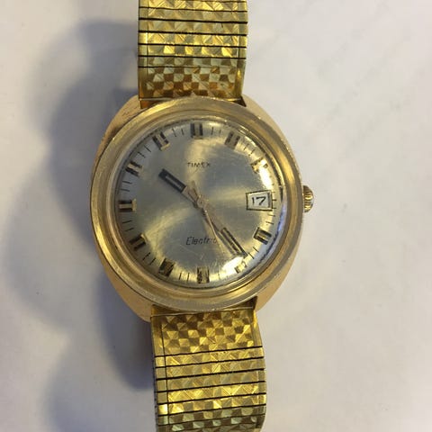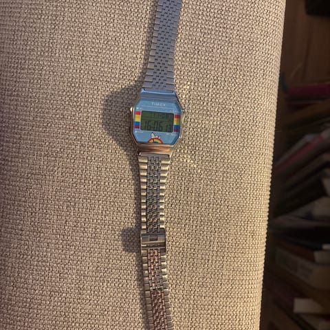 Timex digital ur i guldfarvet metal med digital urskive. Uret er designet til unisex brug og har en justerbar metalrem med lås. Uret viser tid digitalt og har en klassisk retro stil.