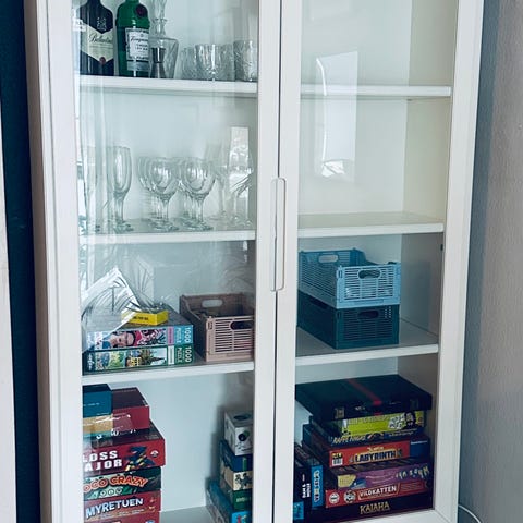 Super fin vitrin skab med ben. Nederste del er skuffer. Har kun haft den i 2 år, kun til mine Georg Jensen pynt.