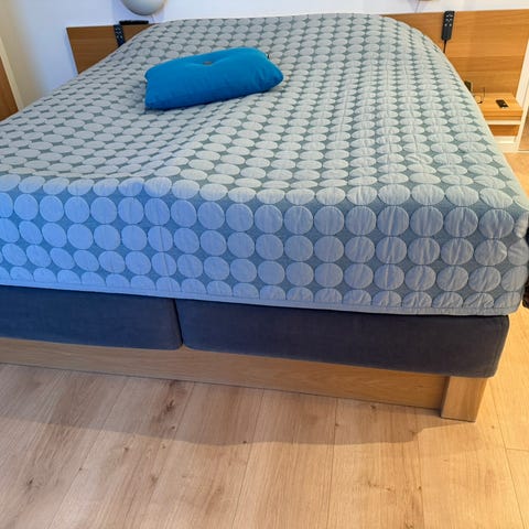 Dobbelt seng med delt elevation og madrasser. Brugt men i god kvalitet og god stand. Elevation af mærke TÜV/OKIMAT og velfungerende. Latex Energy madras 85x200 (2 stk) som i sig selv har kostet 7998,- Dertil topmadras i god kvalitet af mærket ProSleep. Rammen er af ukendt mærke men i pæn stand med to sengegavl incl hylder.